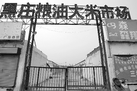 这片拆迁工地的对面,“黑庄粮油大米市场”的牌子还在,但大门上了锁。市场内的商铺,都锁着门。
